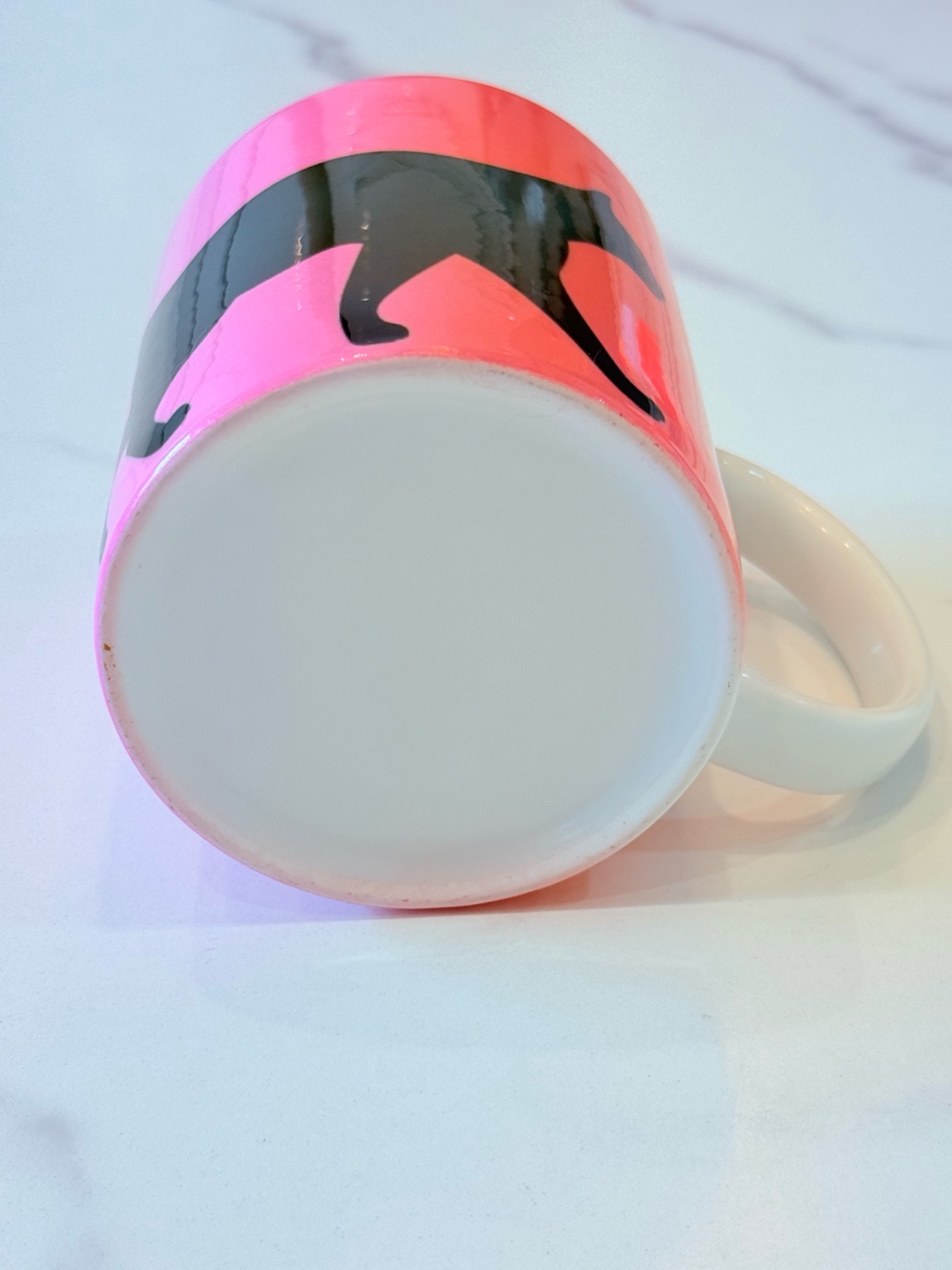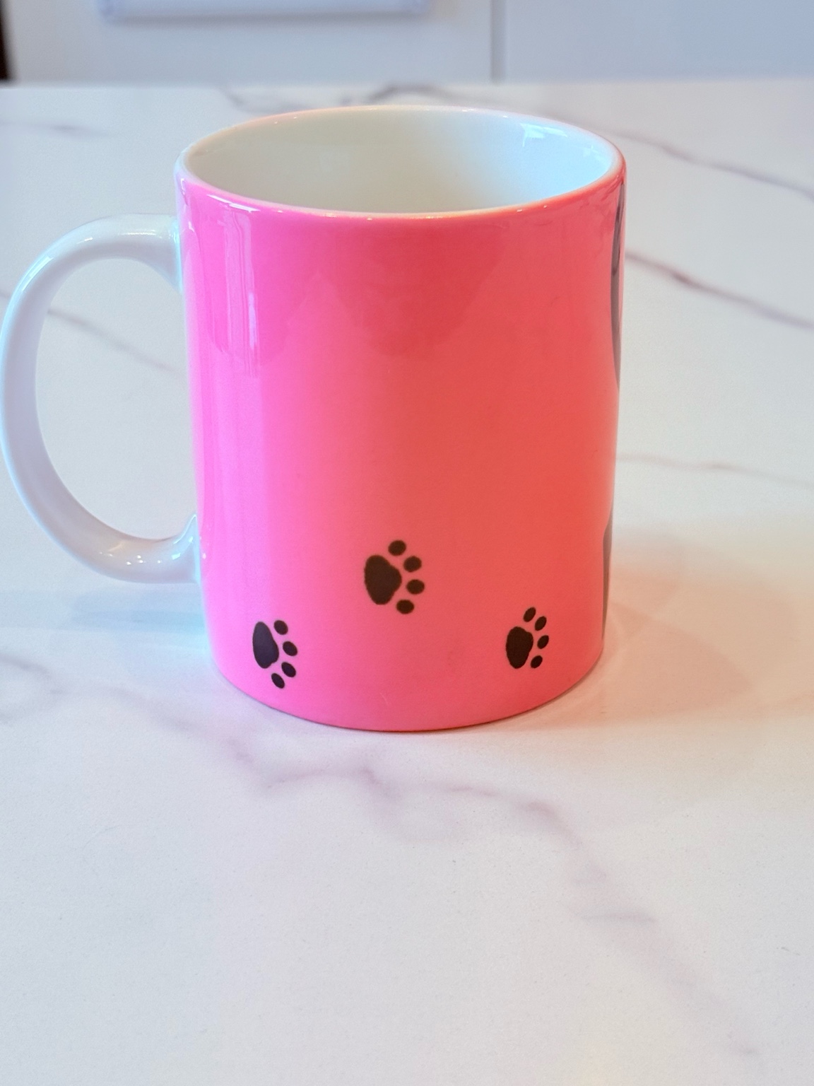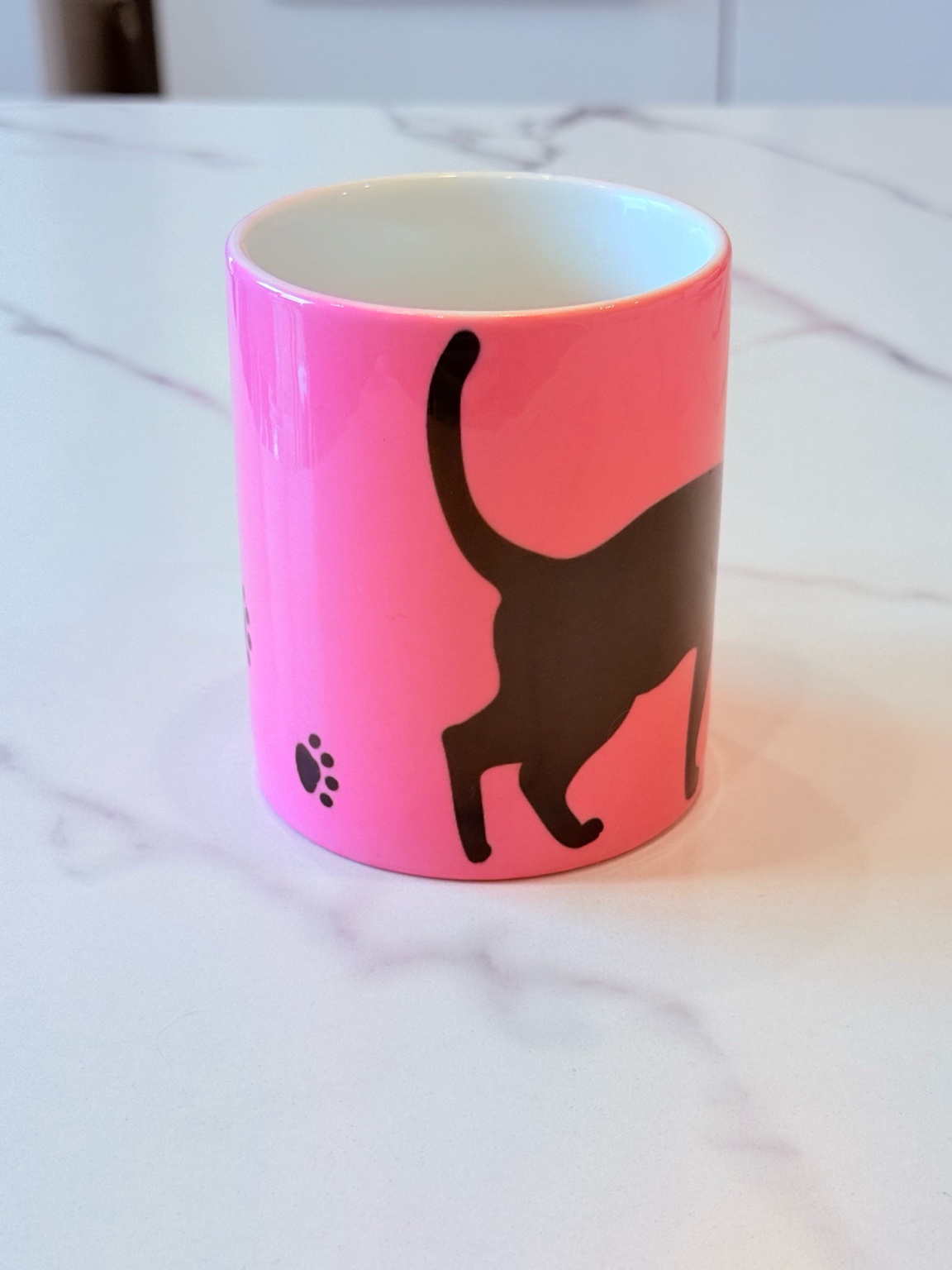 鮮やかなピンクに、歩く黒猫のシルエットと可愛い肉球がデザインされたマグカップです。