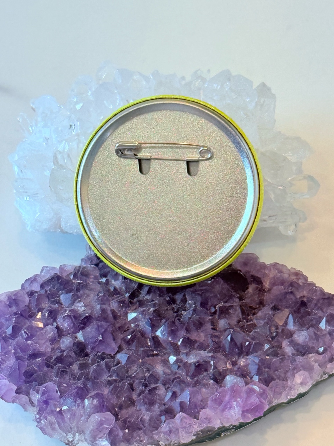 鮮やかなイエローの背景に、力強い筆文字で「天真」「爛漫」とデザインされた缶バッジ。