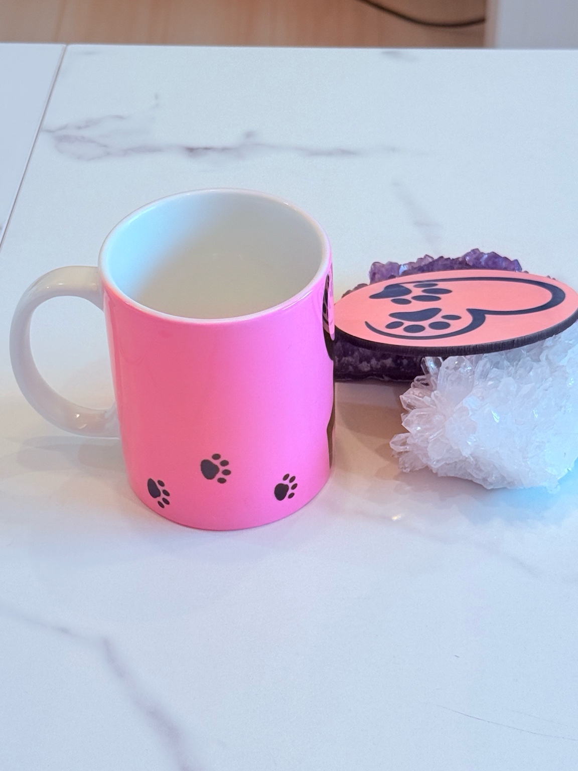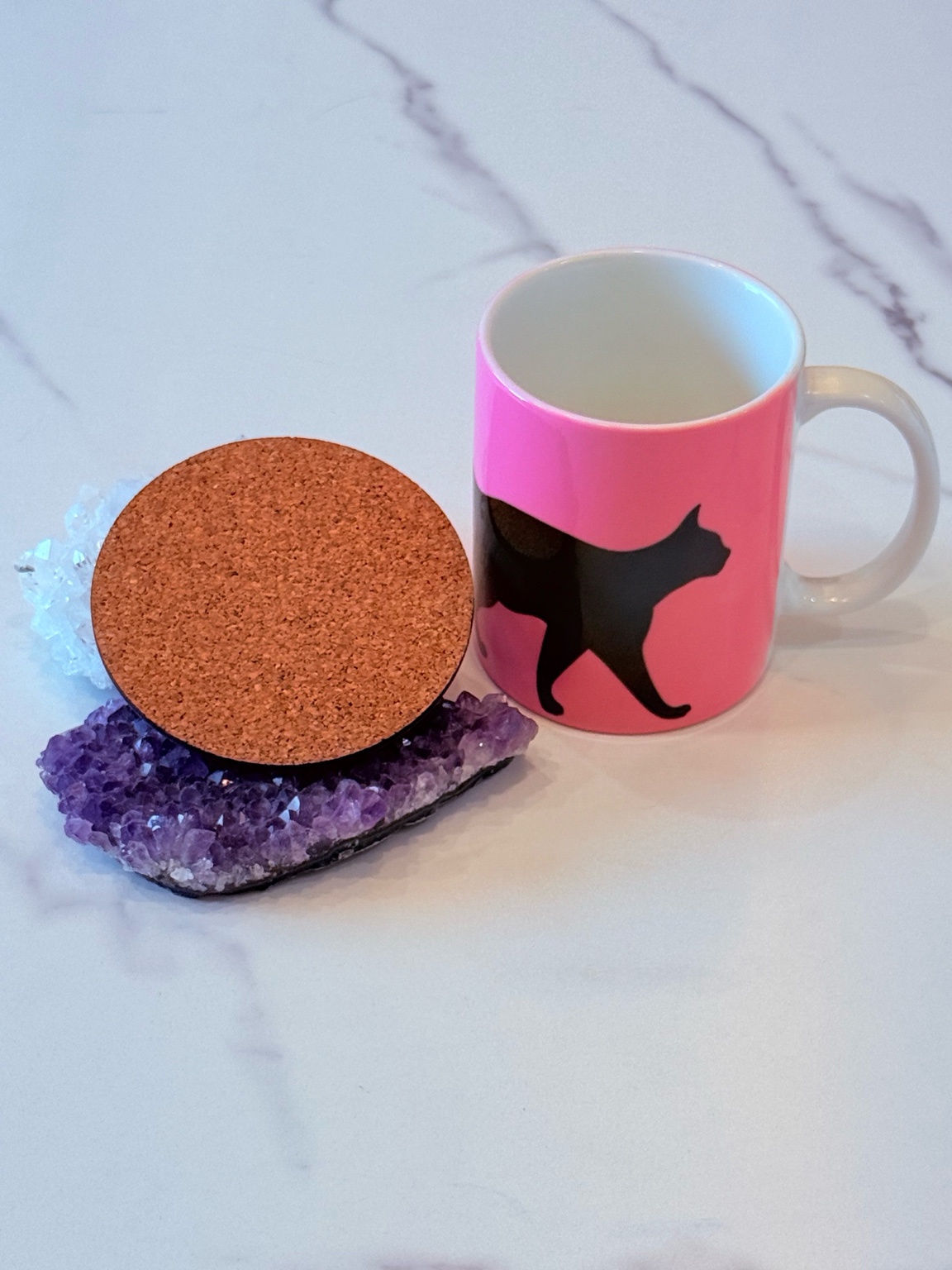 鮮やかなピンクを基調にした、黒猫シルエットのマグカップと、ハート&肉球デザインのコースターがセットになったアイテム。